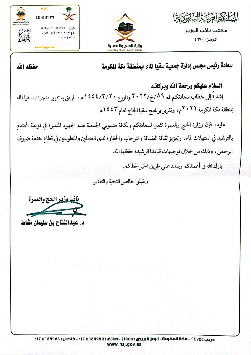 خطاب شكر من معالي أ.د. توفيق بن فوزان الربيعة وزير الحج والعمرة .